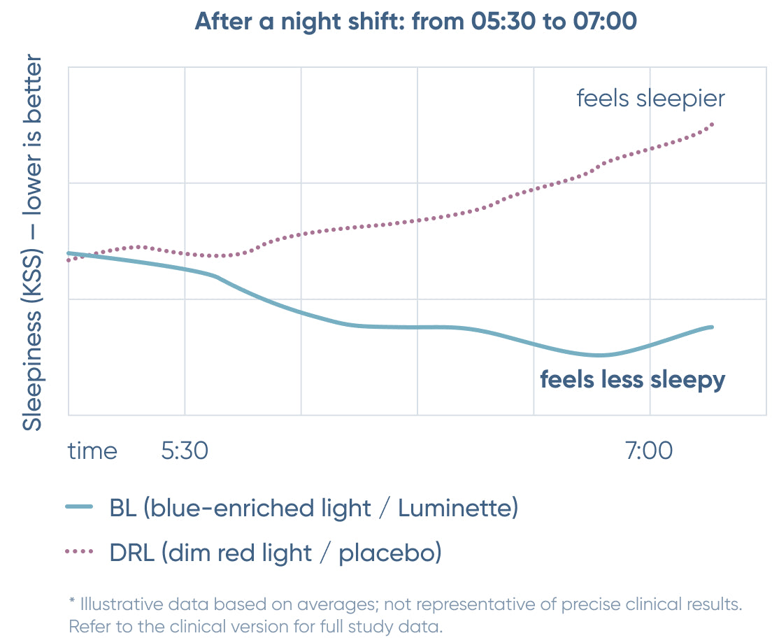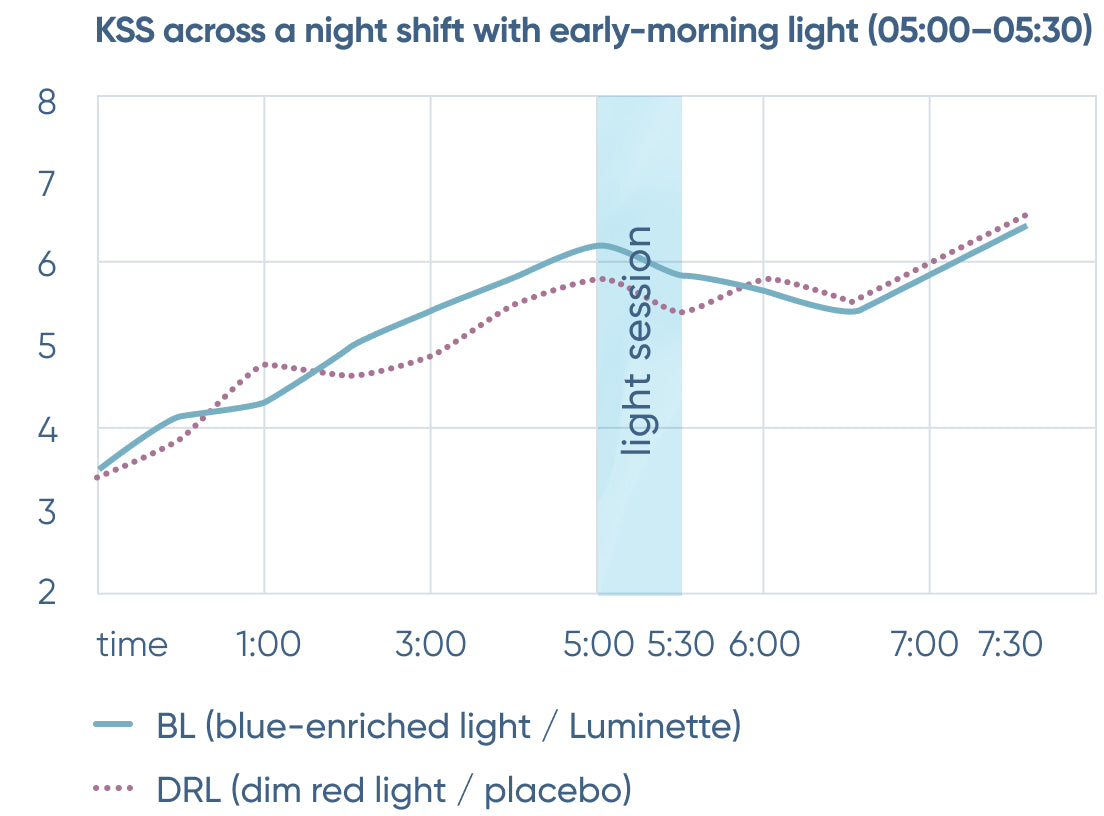 This exploratory study followed 21 individuals working night shifts, who recorded their perceived sleepiness hourly from 21:00 to 07:30. Participants used either Luminette® or a reference light during a short session between 05:00 and 05:30. Following the light session, in the group who received blue-enriched light, sleepiness displayed a more prolonged reduction.