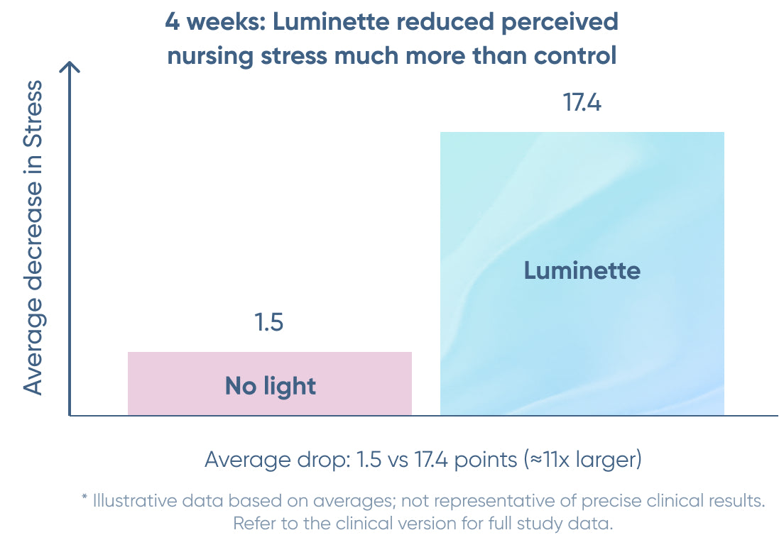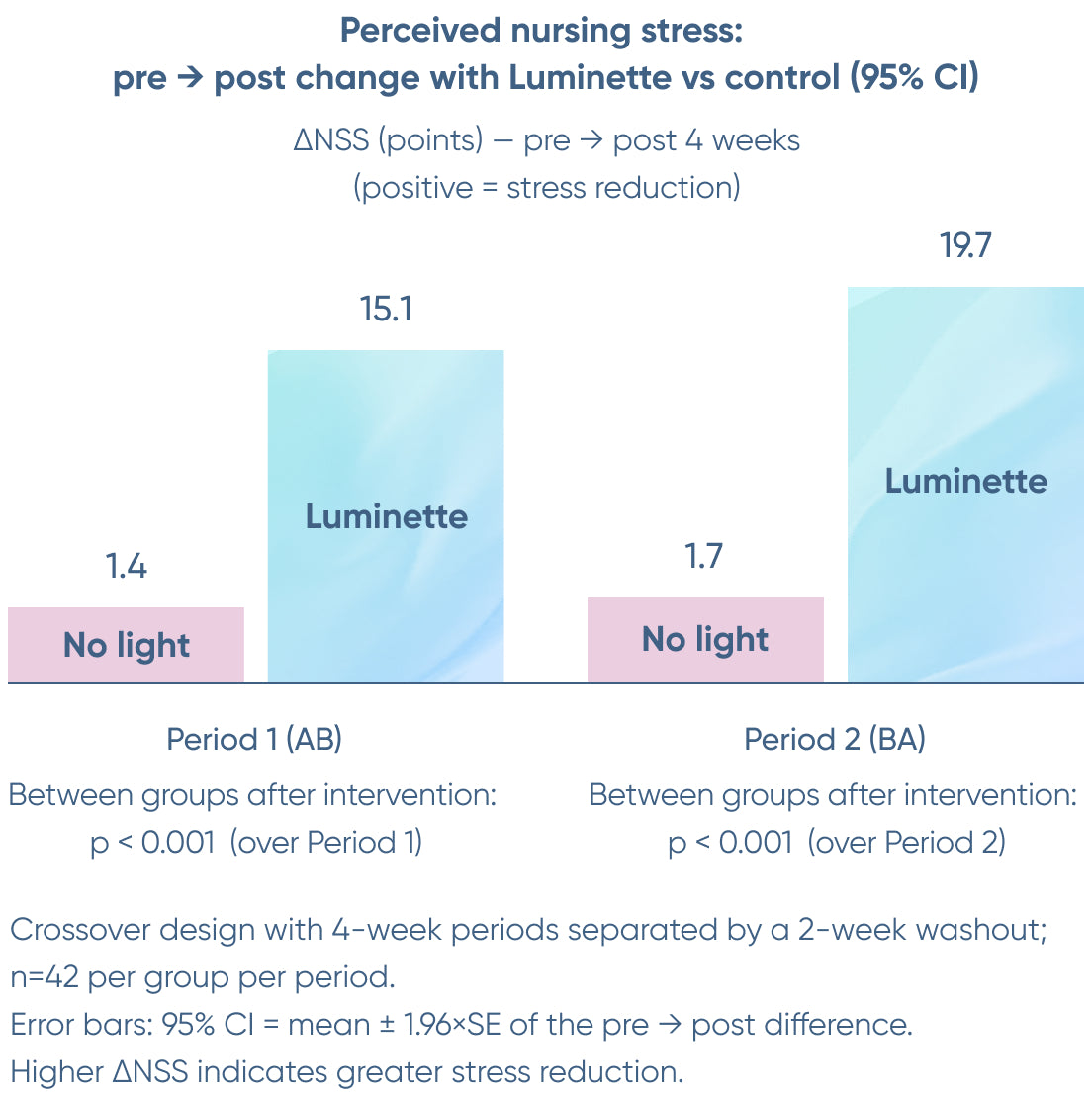 This study followed 84 operating-room nurses across two four-week periods: one with Luminette® use and one without light exposure. Perceived stress was assessed before and after each period. Participants reported larger positive changes during the periods that included Luminette® use, and this pattern was consistent across both study phases.