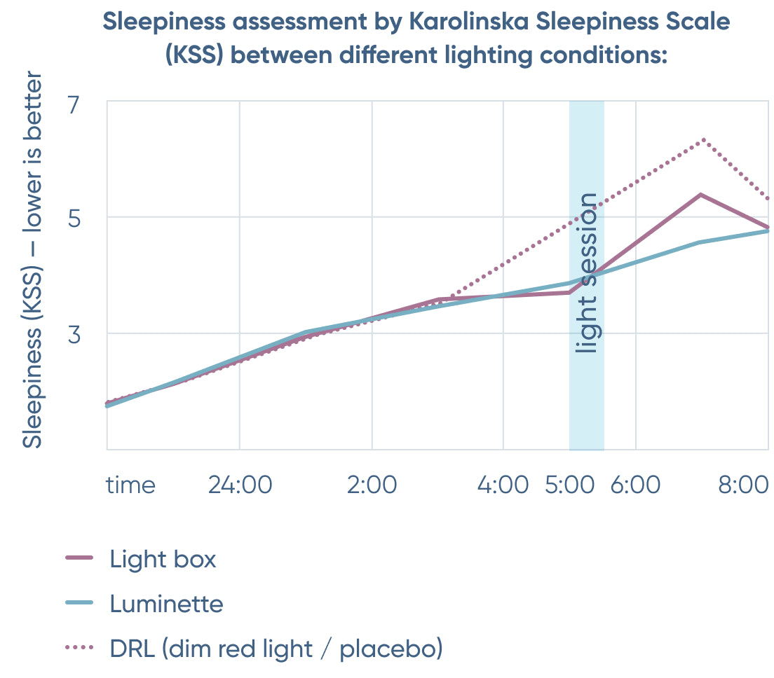 This study examined how individuals responded to early-morning light exposure after a night without sleep. Participants were exposed to different light conditions at 5:00 a.m., and their levels of sleepiness and other attention related measurements were monitored into the morning. Compared with dim light, both Luminette® and a traditional light box were associated with improved sleepiness and attention during the early morning hours. The light sessions were generally well tolerated by participants.