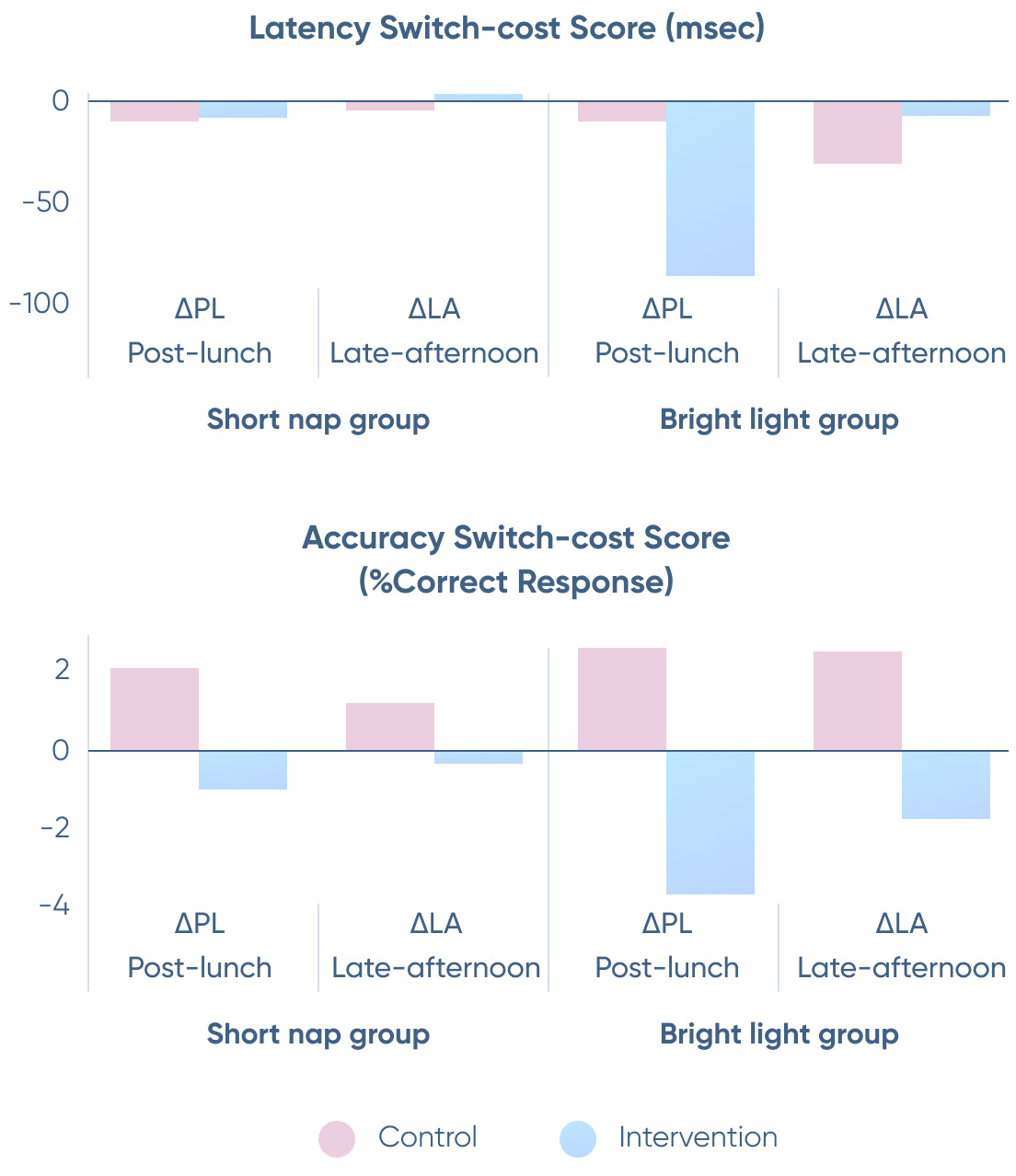 This study examined how different strategies influenced attention and focus after lunch. Participants either rested, took a short nap, or were exposed to different light conditions before completing attention-based tasks. Compared with control conditions, both short naps and bright light exposure were associated with more consistent post-lunch focus and reduced feelings of fatigue. The light sessions were generally well tolerated.