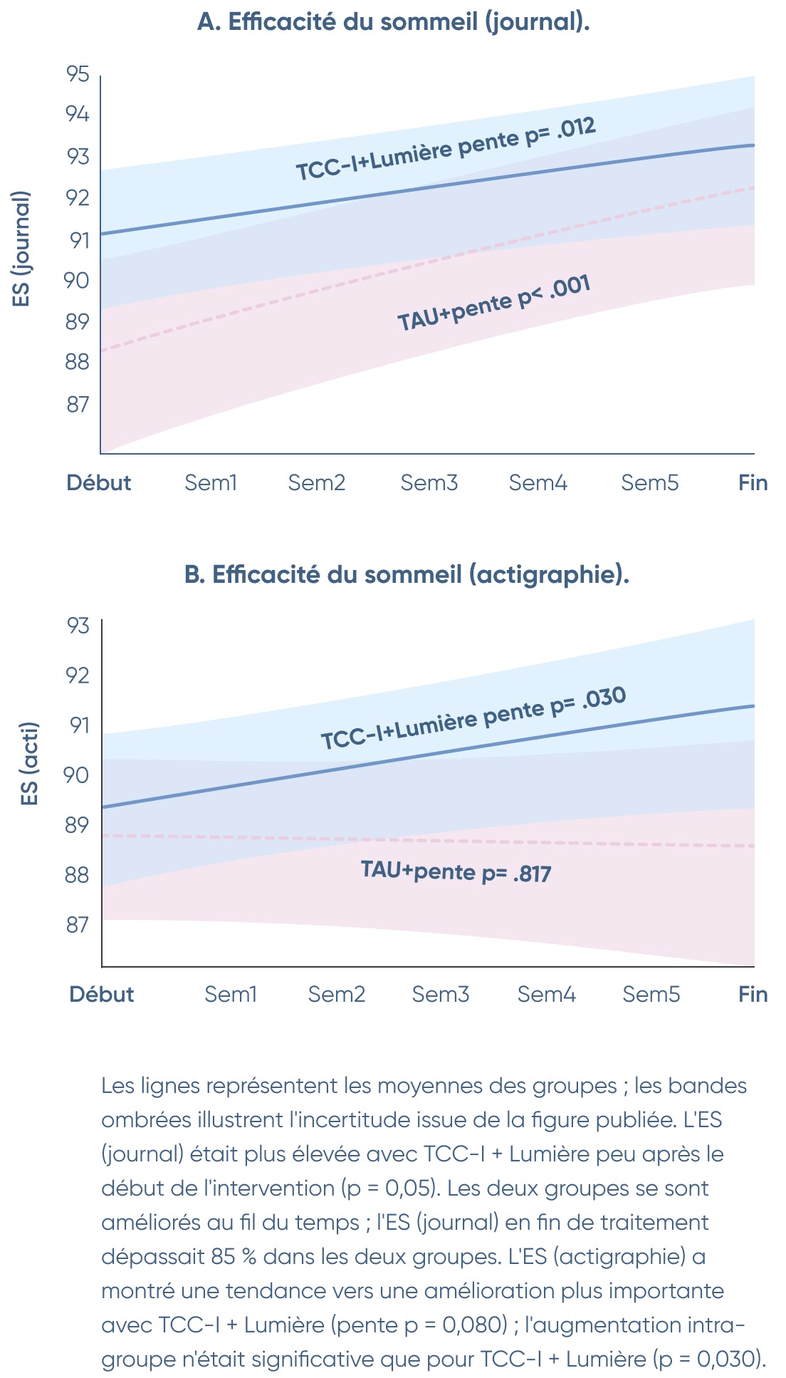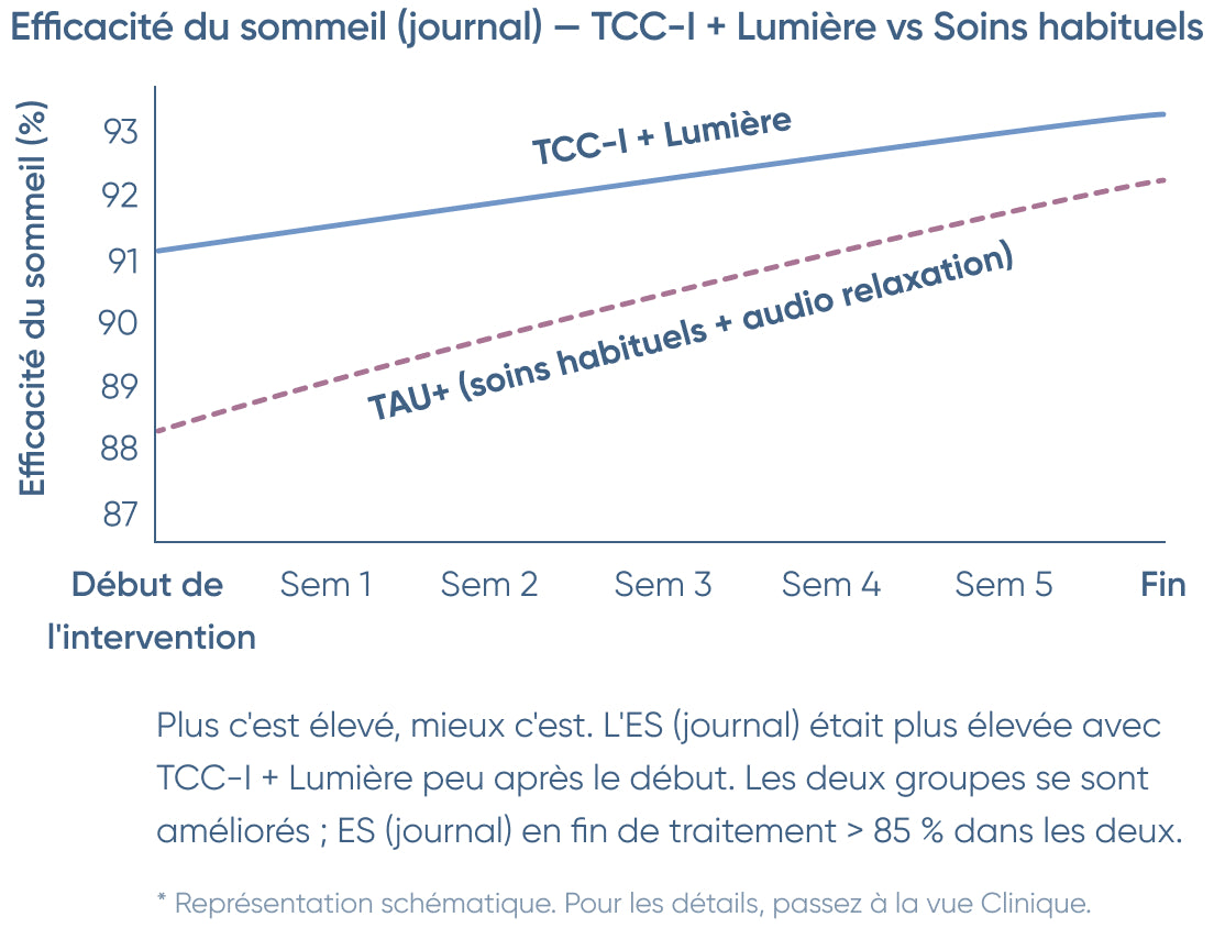 Une étude randomisée menée auprès de femmes recevant une chimiothérapie (n=101) a évalué les effets de 1) une thérapie cognitivo-comportementale brève combinée à une luminothérapie (TCC-I + Lumière) par rapport à 2) un traitement habituel avec audio de relaxation (TAU+) sur les difficultés et l'efficacité du sommeil.