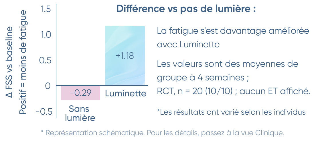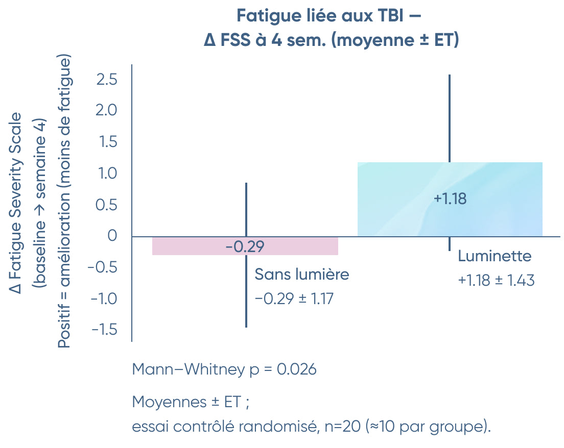 Dans cette étude randomisée, 20 adultes souffrant d'un traumatisme crânien grave ont été assignés soit à une exposition quotidienne à de la lumière enrichie en bleu à l'aide de Luminette, soit à aucune intervention pendant quatre semaines. Les participants du groupe lumière ont effectué des séances de 30 minutes chaque jour. Les scores de fatigue sur l'échelle de sévérité de la fatigue (FSS) ont davantage diminué dans le groupe lumière que dans le groupe sans intervention. S'agissant d'une étude de petite envergure, les résultats doivent être interprétés comme préliminaires.