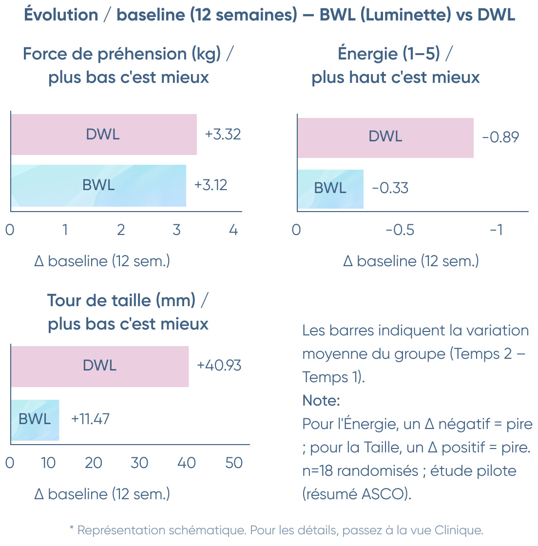 Dix-huit hommes âgés de ≥65 ans débutant un traitement par privation androgénique (TDA) ont été assignés à une exposition à la lumière vive (Luminette) ou à une lumière tamisée pendant 30 minutes par jour pendant 12 semaines. Par rapport au groupe exposé à la lumière tamisée, le groupe exposé à la lumière vive a montré une force de préhension plus élevée et une augmentation plus faible du tour de taille sur la période d'étude (3 mois). S'agissant d'une petite étude pilote publiée sous forme de résumé, ces résultats doivent être considérés comme préliminaires.