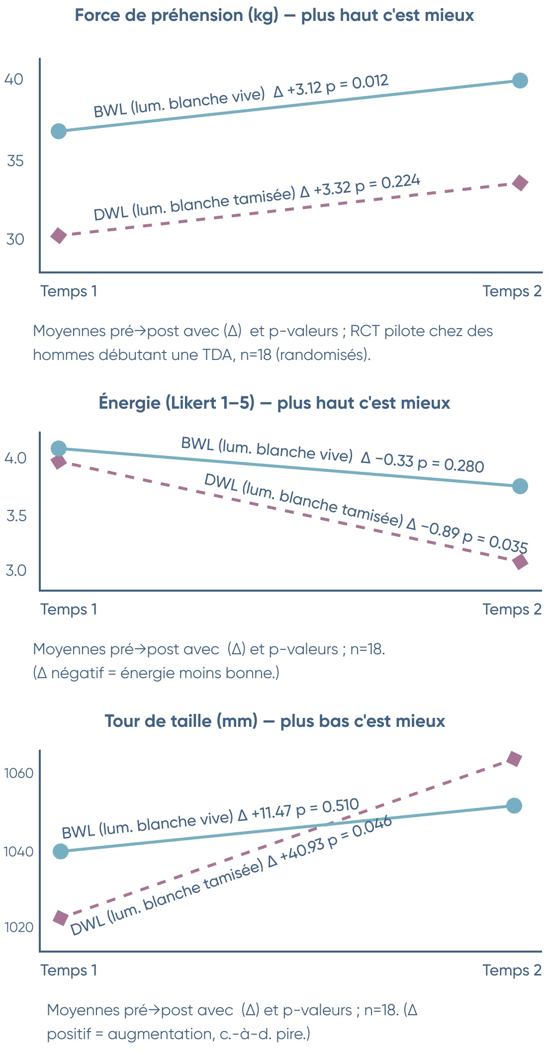 Dans une étude portant sur 17 jeunes adultes en bonne santé, une exposition en soirée à une lumière enrichie en bleu à l’aide d’un dispositif monté sur la tête a été associée à des modifications de mesures liées à la vigilance, comparativement à une condition de lumière rouge. Aucune variation notable des niveaux de cortisol n’a été observée.