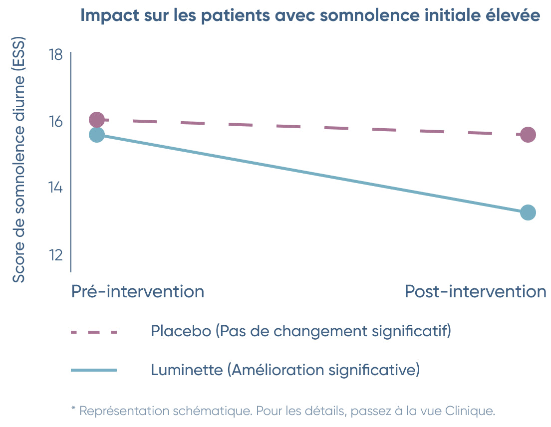 Les résultats suggèrent que les scores de somnolence ont diminué après la luminothérapie, tandis que le placebo n'a montré aucun changement significatif. La qualité du sommeil, l'anxiété et la dépression ne présentaient pas de différences significatives entre les conditions.
