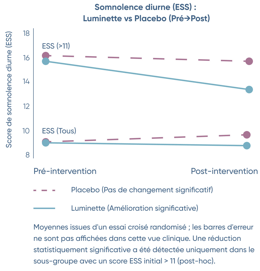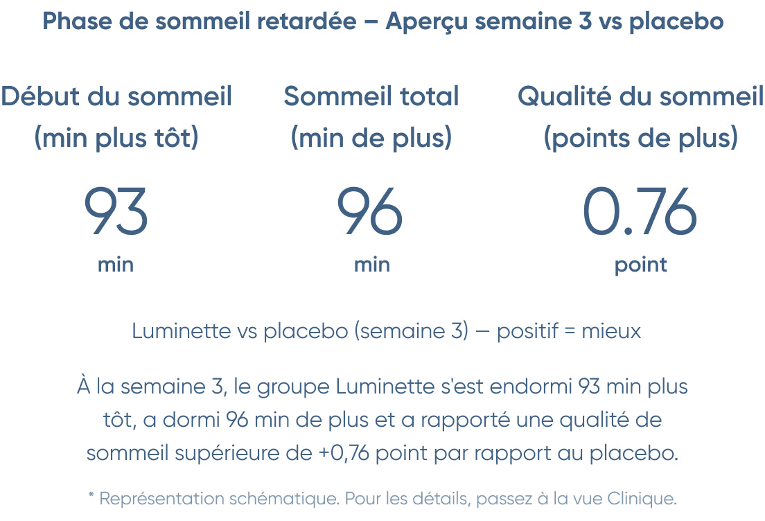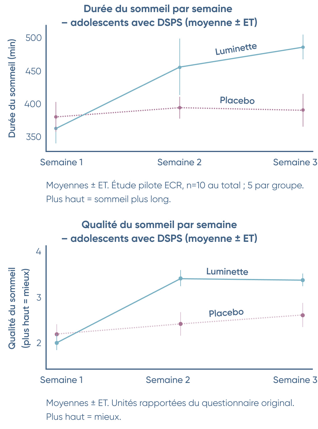 Dans une petite étude pilote en simple aveugle menée auprès d'adolescents ayant des cycles de sommeil et d'éveil tardifs, le groupe Luminette a rapporté un endormissement plus précoce et une durée totale de sommeil plus longue que le groupe placebo. Les participants ont également signalé une amélioration de la qualité du sommeil entre la semaine 2 et la semaine 3. Ces conclusions sont issues d'une petite étude pilote et doivent être interprétées comme préliminaires.