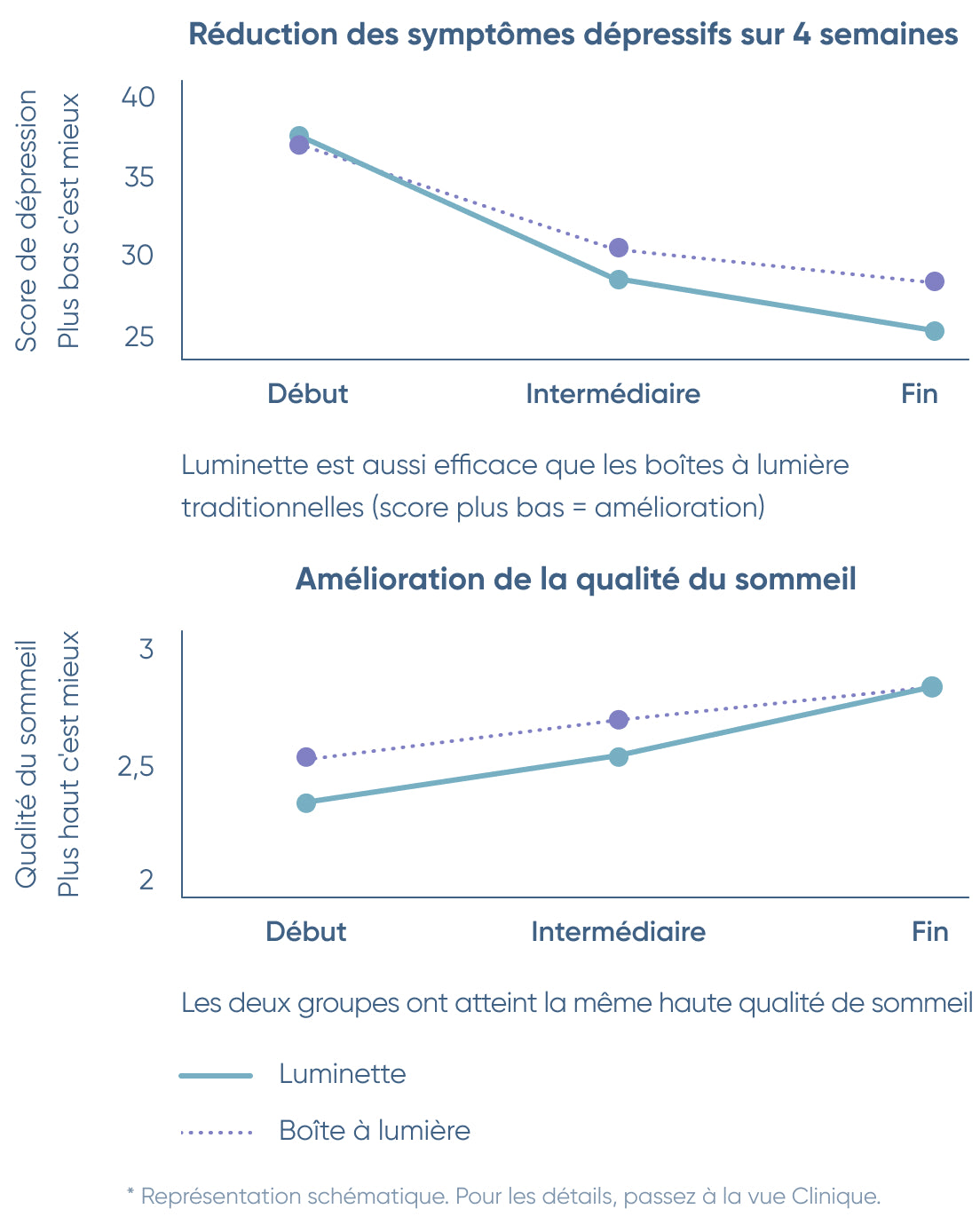 Cette étude de 10 semaines a examiné la manière dont des participants présentant une variabilité de l’humeur réagissaient à l’utilisation de Luminette® le matin ou à midi. Les scores liés à l’humeur ont montré des tendances positives pour les deux horaires. La plupart des participants ont bien toléré les séances. Un petit nombre a présenté des changements d’humeur temporaires, qui se sont améliorés après un ajustement de l’exposition à la lumière.