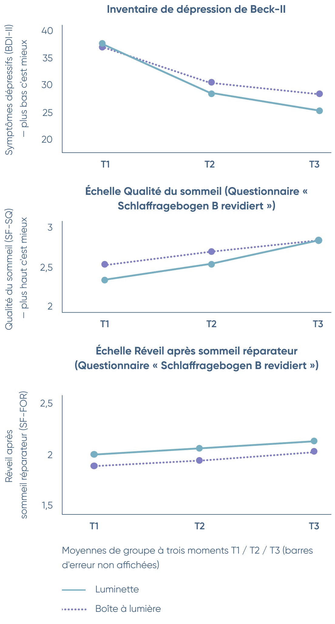 Dans un programme d'hospitalisation de 4 semaines pour 39 adolescents souffrant de dépression modérée à sévère, des lunettes de luminothérapie ont été utilisées en complément des soins habituels. L'humeur, le sommeil et la phase circadienne ont été évalués.
