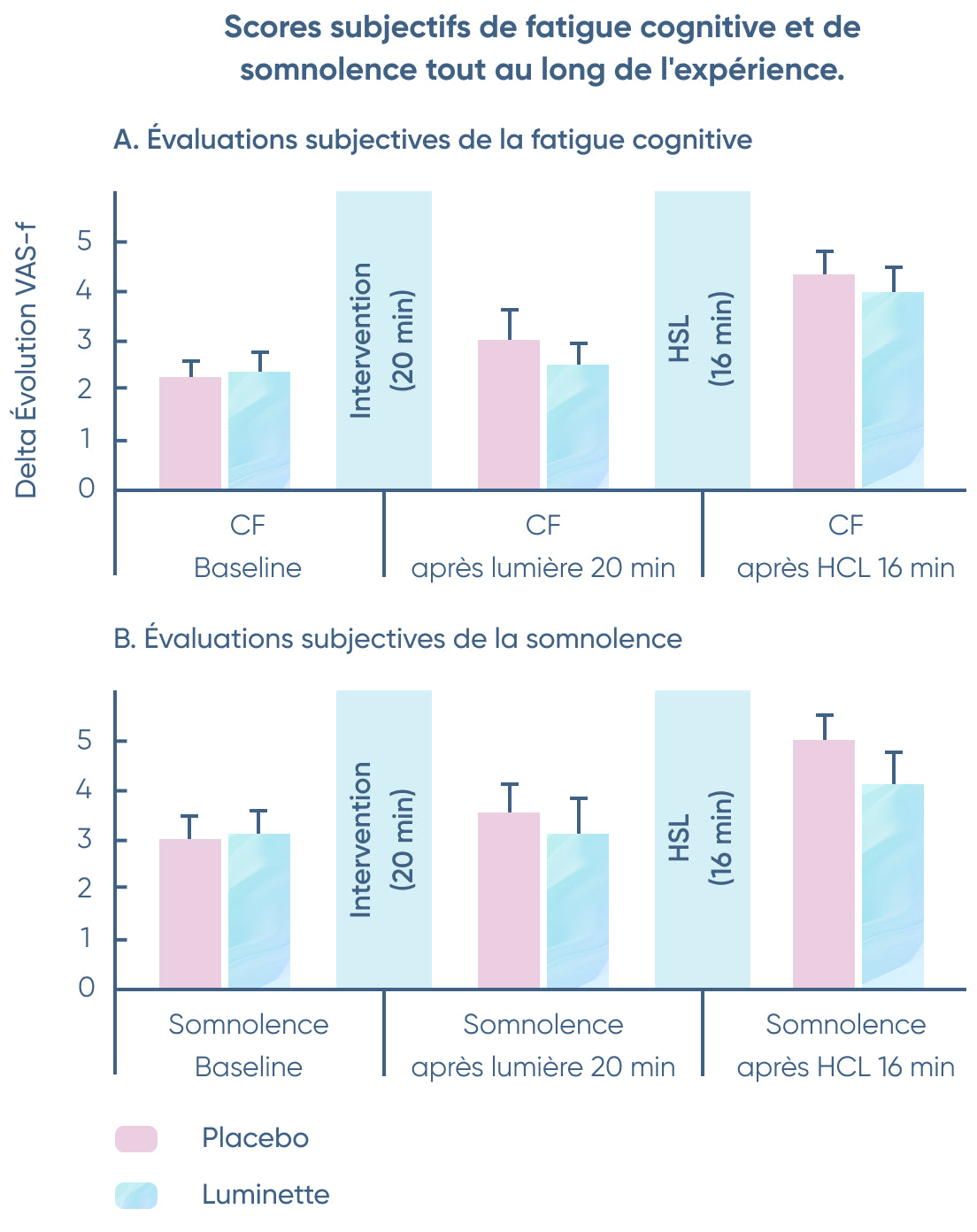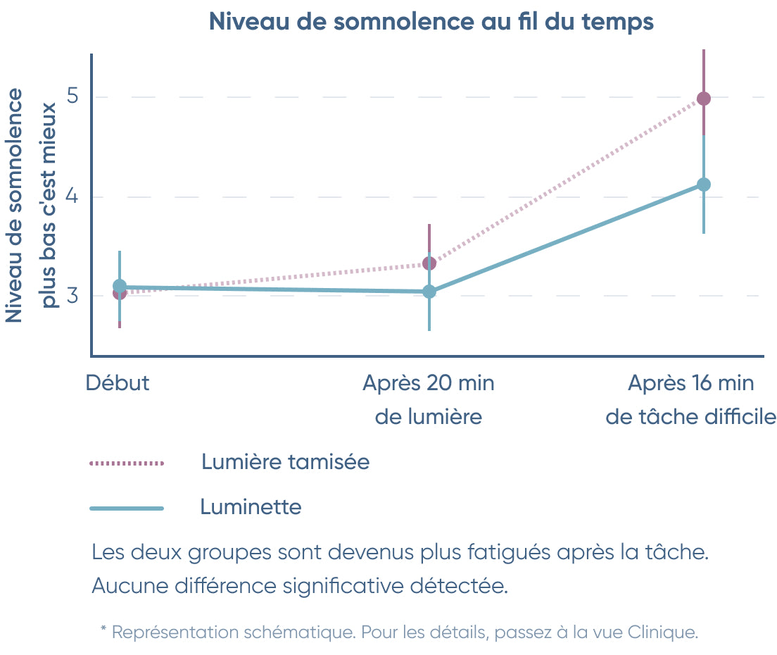 Chez 20 adultes sains, 20 minutes de lumière vive (Luminette) n'ont montré aucun avantage significatif par rapport à une lumière tamisée pour prévenir l'augmentation de la somnolence ou de la fatigue cognitive après une tâche.