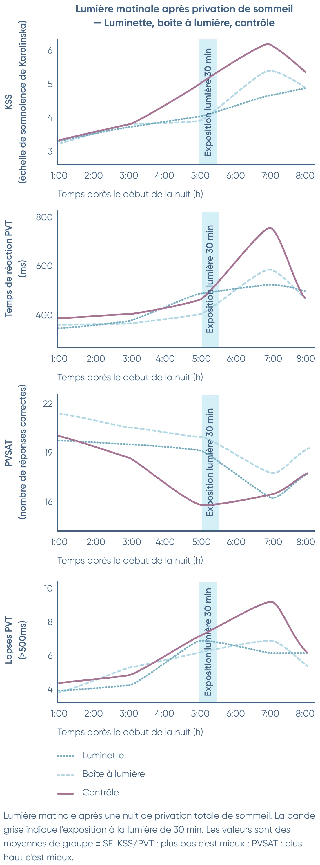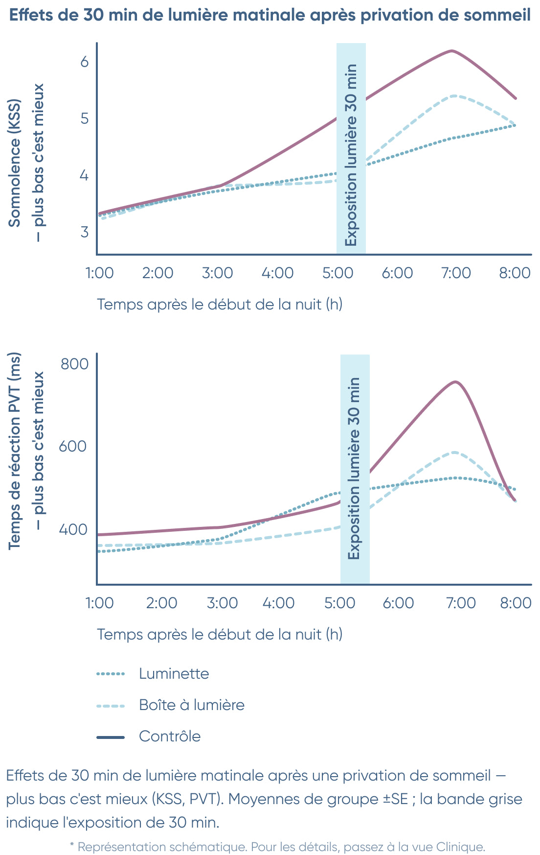Dans une étude portant sur 18 participants privés de sommeil, une exposition à la lumière tôt le matin à l’aide de Luminette® ou d’une boîte de luminothérapie a été associée à des mesures de vigilance et d’attention plus favorables, comparativement à des conditions de lumière tamisée.