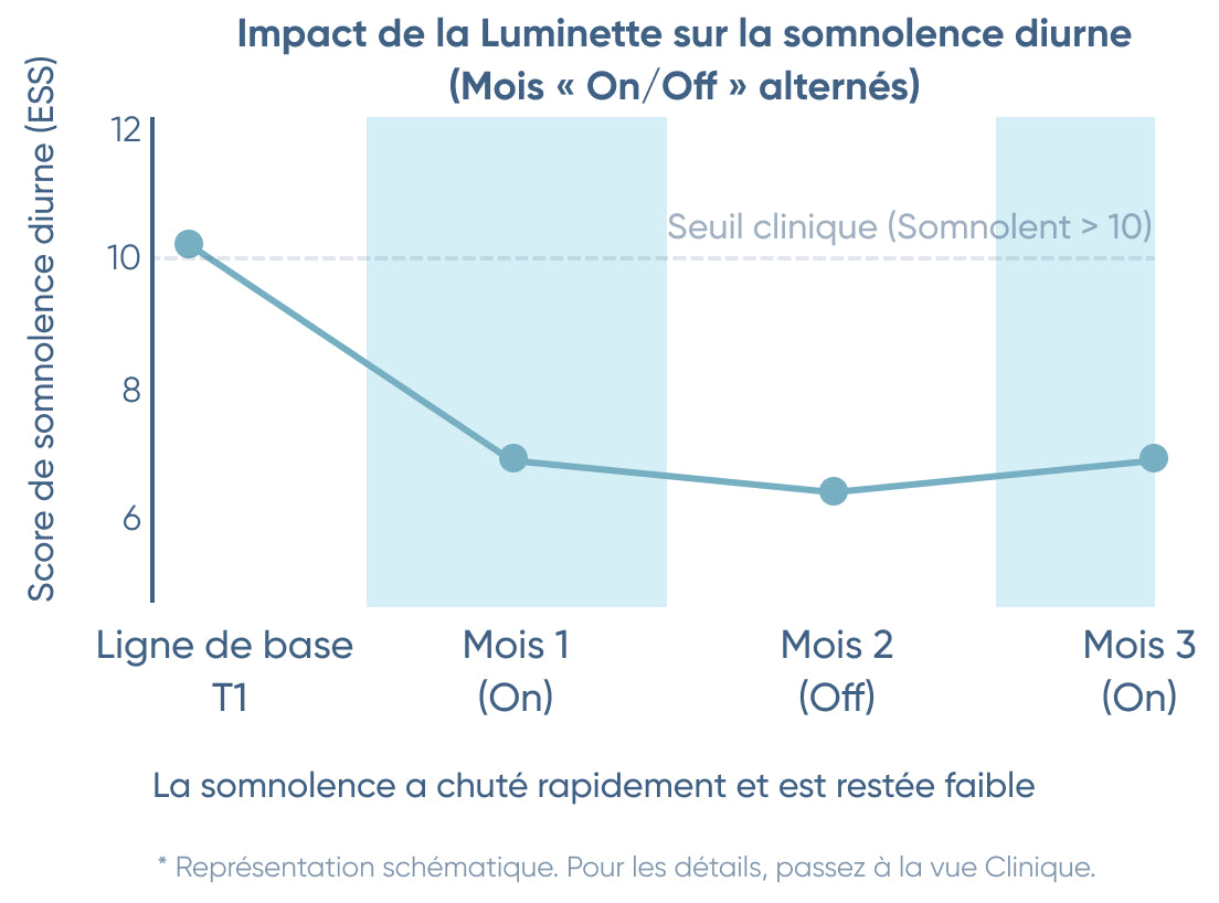 Cette étude exploratoire a suivi 21 personnes travaillant de nuit, qui ont consigné leur somnolence perçue toutes les heures de 21:00 à 07:30. Les participants ont utilisé soit Luminette®, soit une lumière de référence, lors d’une courte séance entre 05:00 et 05:30. Après la séance de lumière, dans le groupe ayant reçu une lumière enrichie en bleu, la somnolence a montré une diminution plus prolongée.