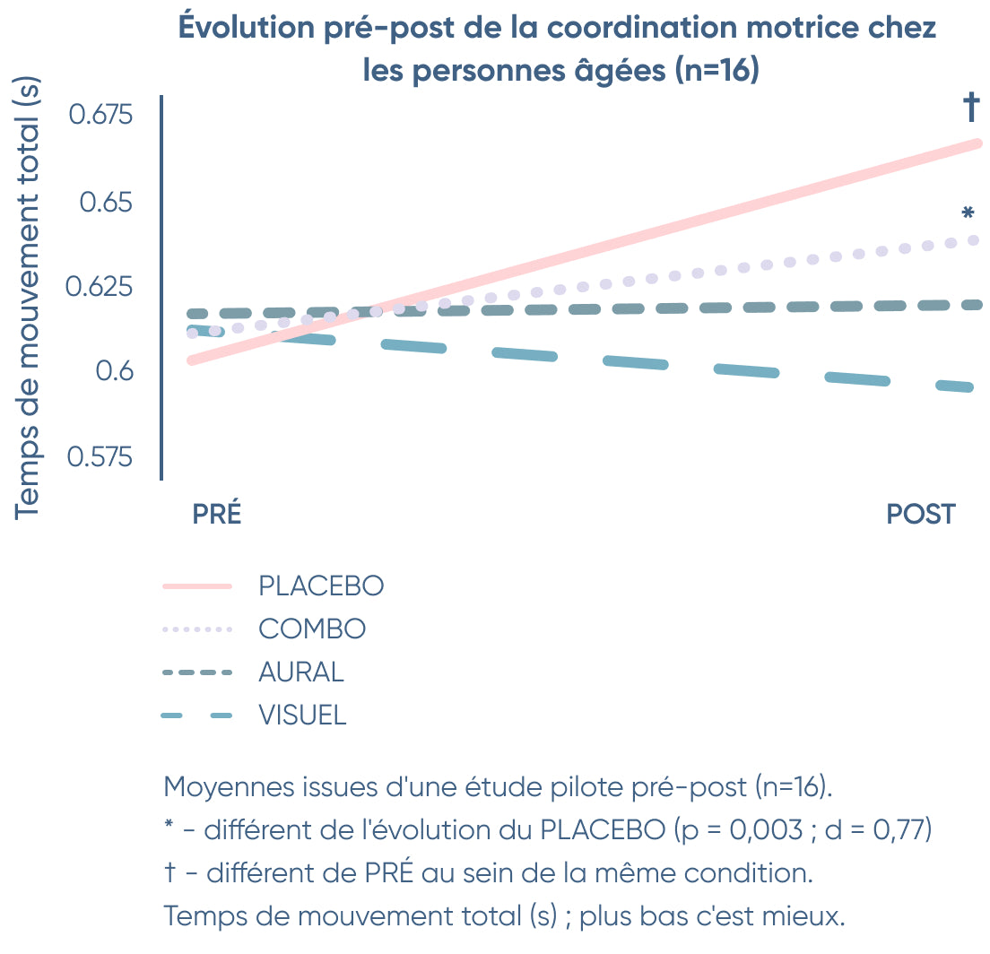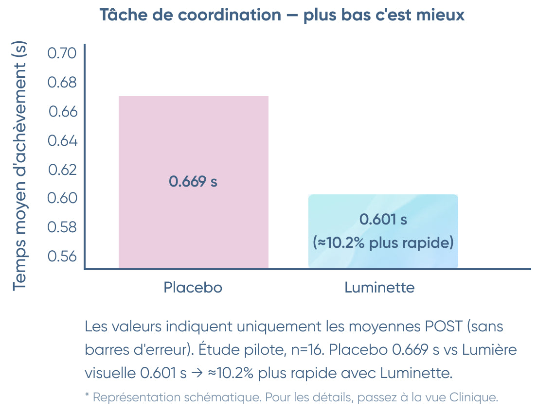 Dans une étude pilote à quatre conditions, des personnes âgées ont effectué une tâche de coordination motrice avant et après avoir été exposées à l'un des éléments suivants : 1) une lumière visuelle enrichie en bleu, 2) une lumière transcrânienne, 3) une combinaison des deux, ou 4) un placebo. La condition de lumière visuelle a été associée à une réduction statistiquement significative du temps de mouvement total par rapport au placebo. La condition transcrânienne ne différait pas significativement du placebo, et la combinaison n'a pas montré de bénéfice supplémentaire par rapport à la lumière visuelle seule. S'agissant d'une petite étude pilote d'une seule session, ces résultats sont préliminaires et doivent être confirmés par des études indépendantes plus vastes.